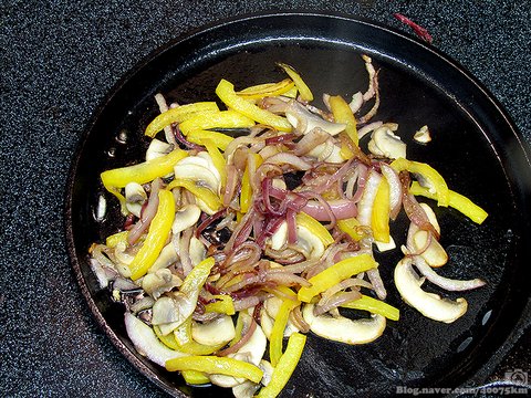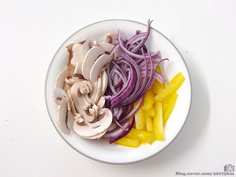 양파와 피망, 버섯을 얇게 썰어서 준비합니다.