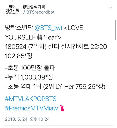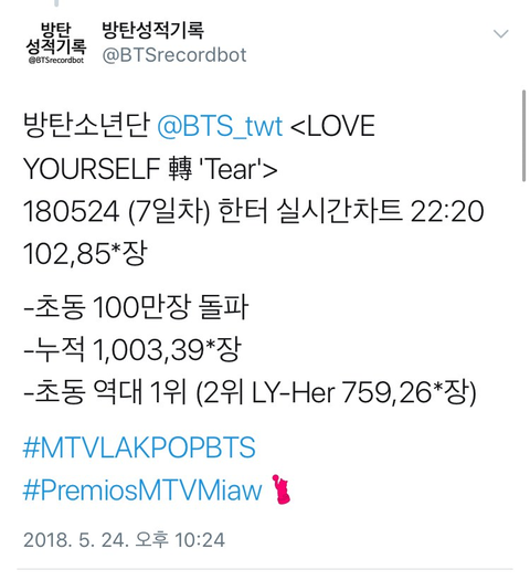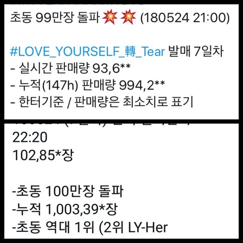 방탄 초동 100만장 돌파했어!!!!!!!!!!