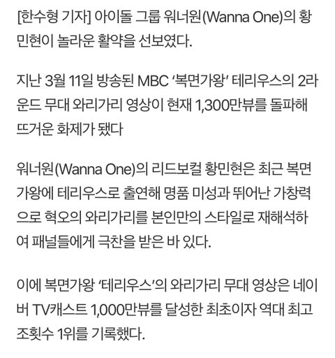 기사)’복면가왕’ 황민현, 화제의 ‘테리우스’ 네이버 TV캐스트 영상 1,300만뷰 돌파…