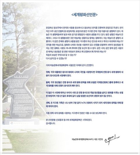 특히 HWPL 이만희 대표님의 연설을 들으면 전쟁종식을 이룰 수 있는 구체적 내용이