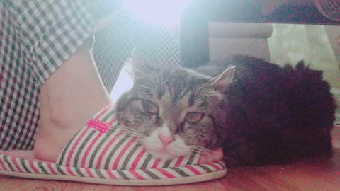 엄마 슬리퍼를 베개 삼아 휴식 중인 나나