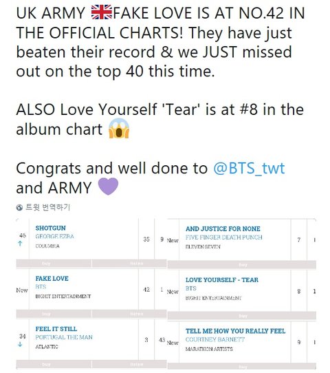 영국 Official Chart 진입(싱글42위 앨범8위)