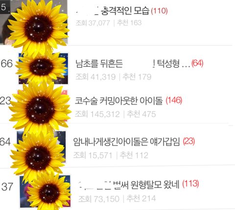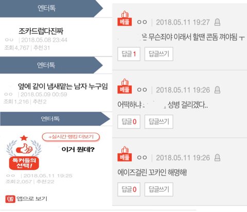 왼쪽은 특정 움짤로 계속 해서 올라온 성희롱글입니다 모두 톡선에 올라갔습니다 오른쪽은 왼쪽 가장 아래 글에 베댓이였던 것들입니다 팬들이 나서서 베댓을 갈았지만 얼마나 성희롱이 심한지 수준을 알 수 있습니다