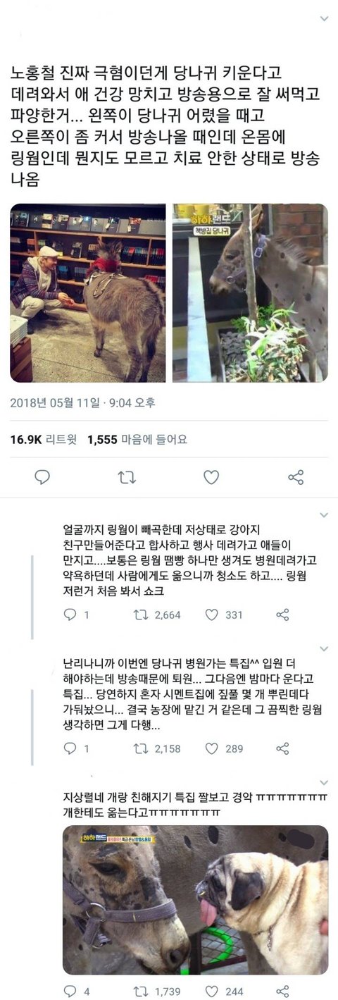무슨 홍키를 방송욕심때매 키워??ㅋㅋㅋㅋㅋㅋ 좀 알고 써; 방송 나오기 전부터 키웠던게 홍키인데 진짜 와전 너무 심해 사람 한명 죽이기 딱이네; 애초에 당나귀같은 동물을 도심에 키우려한건 욕심이라 볼 수 있지만 저 트윗처럼 방송용으로 키운거는 절대 아님 파양한것도 홍키가 적응 못하고 계속 울어서 주위에 피해끼치고 해서 파양한거라 해. 까기전에 확실한 정보인지 좀 알고 까