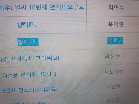 ㅋㅋㅋㅋㅋㅋ두시에 있는 분...? 동명이인 남팬이라기엔 이름도 흔하지 않고 아는 사이에 쓸만한 말투인것도 그렇고 진짠가.. 저분도 군대 가시지 않았나? 누가 장난 친건가... 진짜면 너무 웃길 거 같은데 규 완전 인기쟁이인거 또 한번 입증..ㅋㅋㅋ