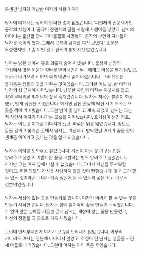 이거 스메랄도 탄생설화 일걸? 럽유셆 하이라이트 릴(럽유셆 시리즈 시작)에서 석진이가 스메랄도 라는 꽃을 들고 나오는데, 그 스메랄도에 대한 설명으로 빅힛이 던져준 떡밥이 블로그고, 거기에 나오는 스메랄도 탄생 설화가 저거야 추한 남자와 그가 사랑했던 여자 이야기. 여자를 위해 더 아름다운 꽃을 만들려고 노력해서 나온 결과가 스메랄돈데, 이 꽃이 결국 여자에게 전해지지 못해서 스메랑도 결말이 '전하지 못한 진심'인걸로 알고 있어.