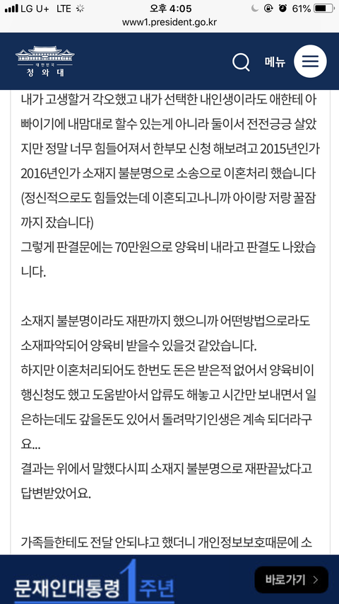결과는 상대방 집나가버려서 전 소재지 불분명으오 이혼도 했고 애기도 혼자 키우게 되었습니다.