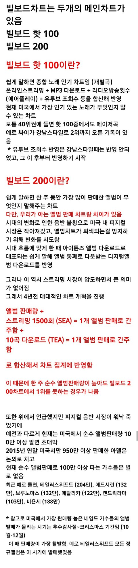 미국내 실물 앨범판매량 + 한 앨범의 전곡 음원 다운+스트리밍 수치 를 합산해서 하는거라 이제 아시아가수는 높은 순위 하는게 어려워짐