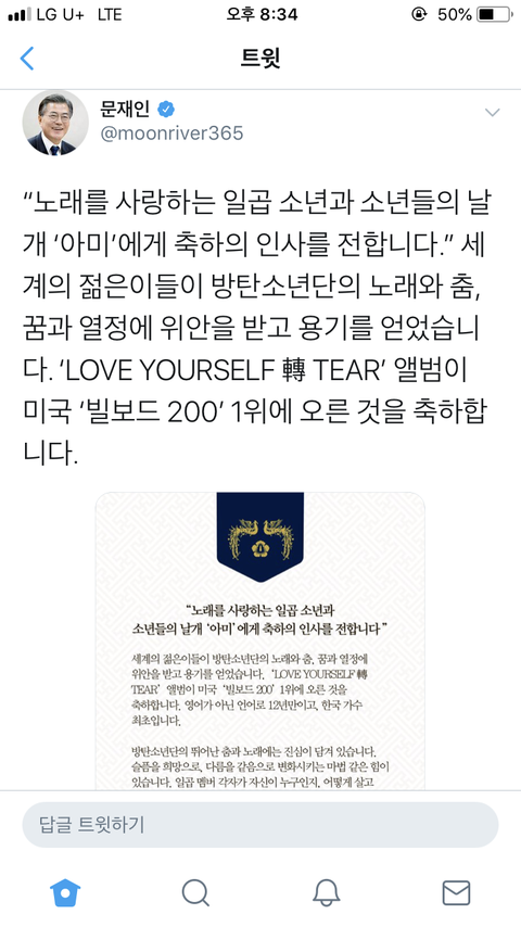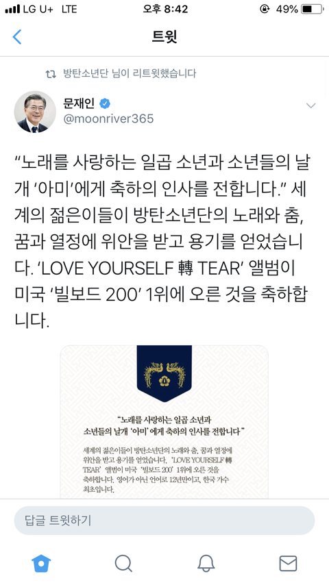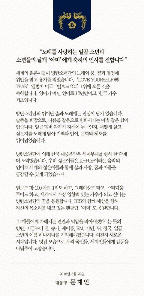와...... 내용도 어쩜....... 대통령님도 방탄을, 아미들을 알아봐주셨다 ㅠ.ㅠ 이제 포털사이트 메인에 기사 좀 하루라도 유지해주지??? 오늘 기사가 내리락 하는거보고 우리나라 빌볻 참 쉽게? 별거아니구나? 생각하는건가 싶었다 ㅋㅋㅋㅋㅋ