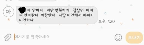 나 : 오지마라 누구 이혼당하는꼴 보고싶나? 나 좀 그만괴롭혀라!! 아빠 여기 오는 순간 내 죽는줄 알아라!!! 여기 오면 내 확 죽어버릴꺼다!!!!온나!!!올라온나!!!내 확 죽어버리게!!!지금당장 올라온나 내 죽어버리게!!!