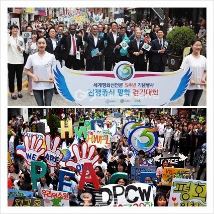 여기 평화를 이루는 사람들이 있습니다.여기 평화를 행하는 사람들이 있습니다.세계평화선언 5주년을 기념하는 사람들!