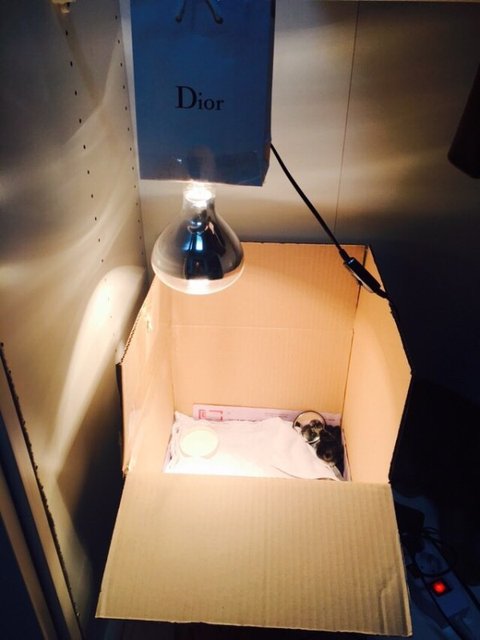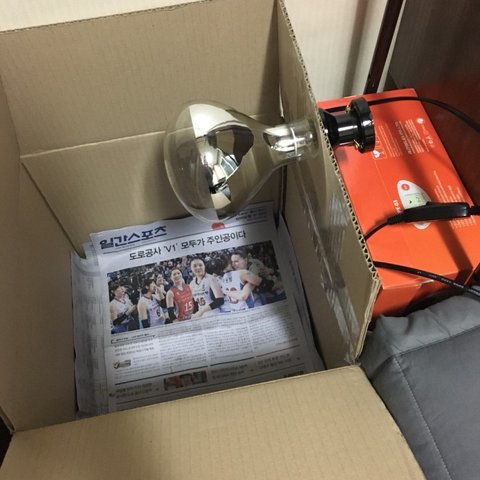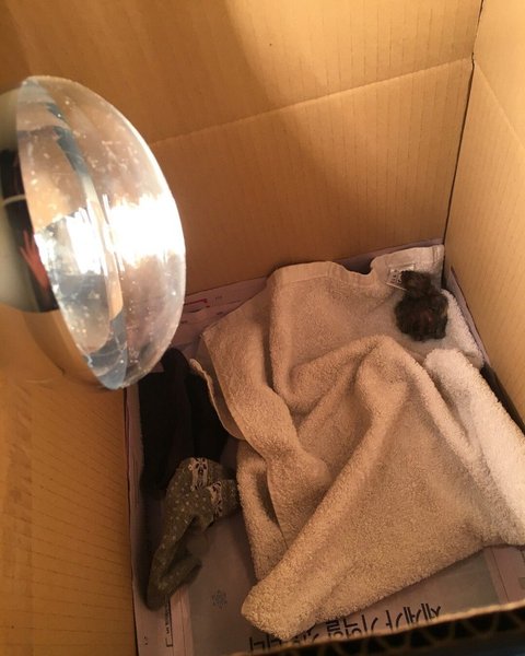무무가 부화해서 급하게 박스에 신문지 깔고 전구만 연결한 상태