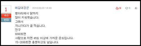 ※ 참고 : 60W 온도는 45도 이상에 가까운 온도로 한마리의 경우 15~20W 정도면 충분
