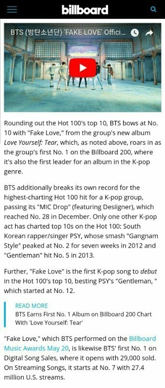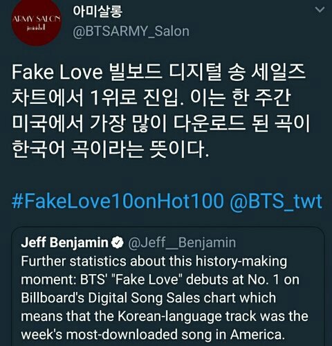이틀 전에 빌보드 200 앨범차트 1위 한걸로도 벅찬데 (이번 컴백 성적들로만 나열하자면 5.22 톱소셜 아티스트 1위 2년연속해서 상받음, 5.25 이번 앨범 초동 100만장 돌파, 5.26 시청자수가 무려 1억명이 넘는 엘렌쇼에 재출연, 5.27 fake love 뮤비 조회수 8일 만에 1억뷰 찍음) 10위라니 .. 말도 안 돼!!