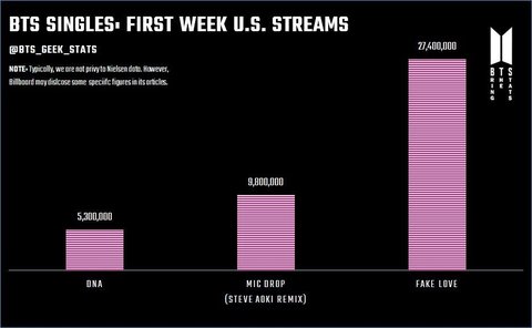 요건 싱글차트 첫주 스트리밍표야! 이번 fake love 스트리밍 지수 보면 mic drop에 비해 거의 세배 정도 늘었어 ;;; 잘하면 10위로 끝나지 않고 top5도 노릴 수 있을 것 같아 !!
