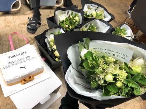 꽃다발 멤버별로 챙긴듯ㅋㅋㅋㅋㅋㅋㅋㅋㅋ 참 올바른 광고주와 모델 저 얇은 발목의 주인은 누굴까 애들 다 앏은데 누구지 윤기 아님 남준이