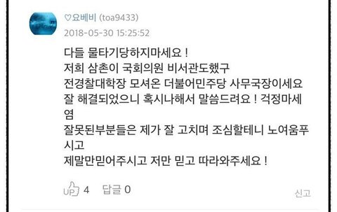 모든 일이 좋게 끝난 것처럼 보이지만, 제가 이렇게 글을 쓰는 이유는 다름이 아닌 요베비가 자신의 친척의 권력을 이용하여 이 일을 희미하게 끝내려고 하기 때문입니다. 이로 인하여 저희 학교의 수위아저씨는 일자리에서 잘릴지도 모르는 곤경에 처하셨고, 요베비는 출입증 없이 학교에 무단 침입을 한 것과, 학생들 앞에서 옷벗기 등을 아무일도 아닌 것처럼 끝내려고 하며, 학우들은 사태의 심각성을 모르고 요베비가 학교에 등장한 것이 재미있는지 "또 와달라." 진정한 여통령이다." 등 이 상황을 즐기고만 있습니다. 또한 요베비는 말만 사과문인 사과문을 올리기는 했습니다. 하지만 사과는 자신이 잘못함 점과 사과 대상이 올바르게 표기되어야 되며 정중하게 써야된다고 생각합니다. 하지만 요베비가 쓴 사과문을 보면 정중함은 커녕 진정성도 보이지 않습니다. 제발 이 일이 쉽게 덮여지는 일은 없도록 널리 널리 퍼뜨려주시고 저희를 도와주세요.