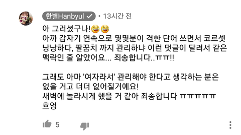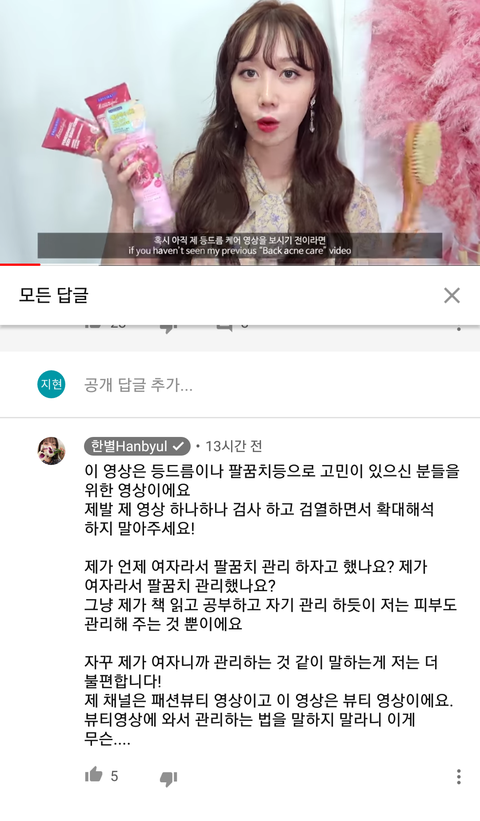페미니즘을 주제로 용기내서 영상까지 제작해 올렸던 여성유투버인데 공격하는 거 무엇;; 영상보면 알겠지만 여자들한테 관리해야한다는 식으로 코르셋을 조인것도 전혀 아니었고 그냥 등드름(+팔꿈치 까만거) 고민인 사람한테 꿀팁을 알려주는 것뿐이었는데 테러당함... 페미니즘 영상 왜 안보이나 했더니 저런사람들때문에 비공개로 돌린듯