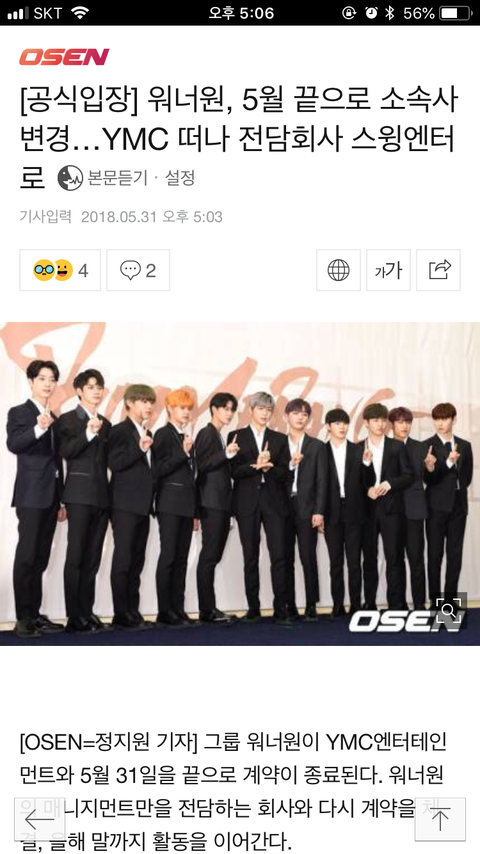 Ymc랑 완벽한 작별은 아니고 협력할거라는데... 뭔가 좀 그렇다 ㅋㅋㅋ 워너원 전담소속사라고 하니까 낫기도 하고... 근데 너무 갑자기 일어나서 당황스럽네