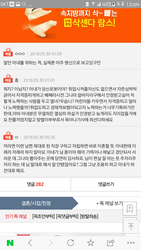 아내 까내리고 무시 한적 없습니다. 이력서 고작 100통 넣고 취직 안된다 그러고, 애기 때문에 자길 안써준다고 하고 자꾸 조급해하다가 진짜 곧 무너질듯한 코딱지만한 사무실 알바로 들어갔어요.