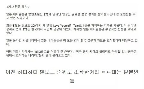 근데 일본에서 방탄 차트기록은 한국정부가 조작한것 이라고 기사가 났어
