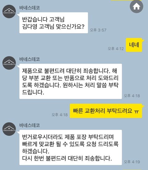 바로 맞교환처리해주신다고 하셔서 다시 테이프로 포장해두고