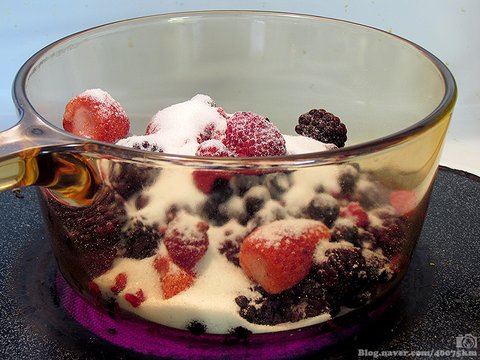 딸기들을 으깨면서 과즙이 저절로 나오기 때문에 따로 물을 넣을 필요는 없습니다.