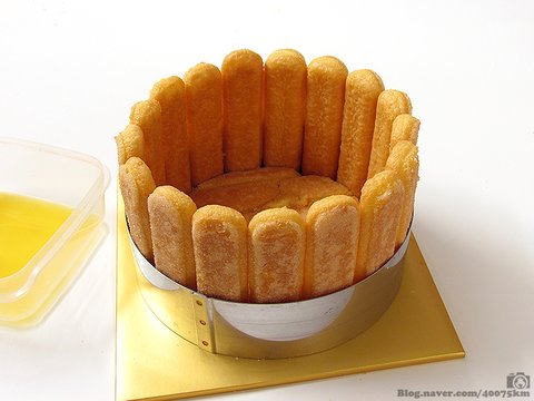케이크 틀이나 무스틀 바닥에 적신 레이디핑거를 깔고, 그 주위를 빙 둘러가며 레이디핑거로 벽을 세웁니다.