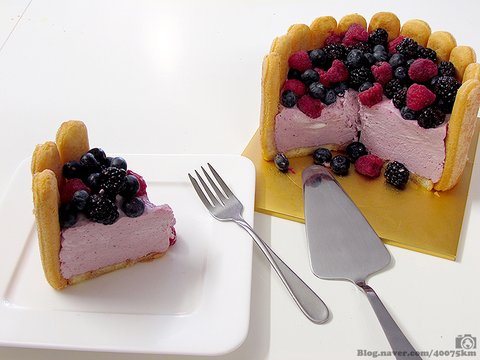 냉장고에서 서너시간 가량 식혀서 완전히 굳힌 다음, 위쪽에 남아있던 베리들을 얹으면 완성입니다.