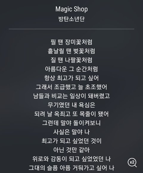 팬톡에 타팬들 글이 이미 많아서 나까지 남기기 미안하긴 한데..... 맨 위에 '필땐 장미꽃처럼 흩날릴땐 벚꽃처럼 질땐 나팔꽃처럼' 이 부분 혹시 멤버들이 쓴 거야? 진짜 이거 쓴 사람 개천재인 거 같애 가사 보면서 듣다가 울컥.. 혹시 알엠인가