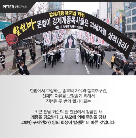 안녕하세요?요즘 전국적으로 강제개종금지법이 화두로 떠오르고 있습니다.그 이유는 무엇일까요??왜냐면 종교자유국인 대한민국에서 교단이 다르다는 이유만으로 강제로 개종을강요하는 일이 빈번히 발생하고 있기 때문입니다.그 결과 지난 1월!! 광주에서 꽃 다운 청년이 질식사하는 사건이 벌어지게 되었는데요.