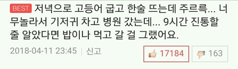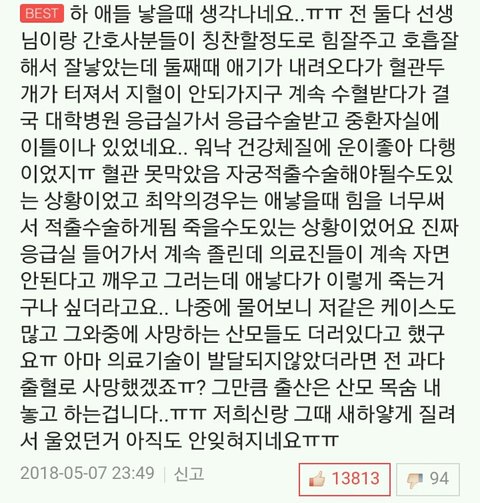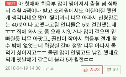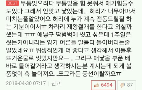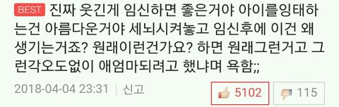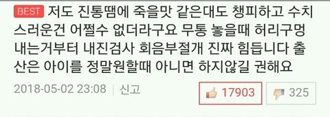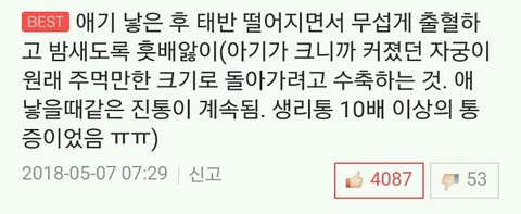 어이없는게 해본 당사자들이 아프고 죽겠다는데 안낳아본,안낳을 남자들이 임신으로 징징댄다고 ㅈㄹ하는 댓글 많이봄
