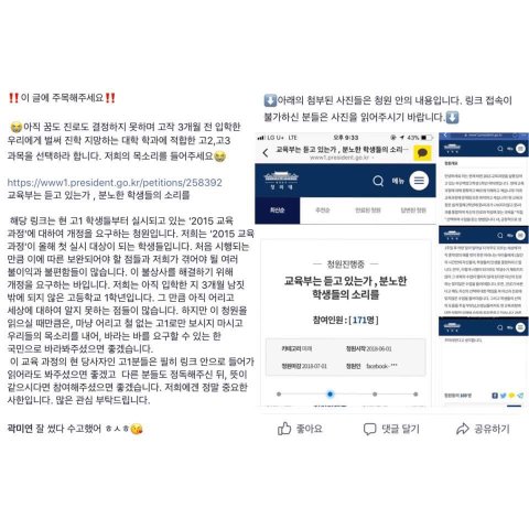 안녕하세요 저는 주위에 보이는 평범한 학생들 중 한 명인 고1 학생입니다 . 여러분들은 현재 고 1들에게 적용되어지고 있는 교육과정에 대해 잘 알고 계십니까? 현 교육과정에 대해 저희는 물론이고 부모님 , 선생님들까지 정확한 이해와 빠른 대처가 잘 이루어지지않고 있습니다 . 이러한 판국에 저희들에겐 주어진 시간은 1달입니다. 1달안에 저희들의 고2-고3의 인생 또는 한 평생의 인생이 좌우될 수 있습니다. 만약 아무런 반응 없이 현 교육과정이 실행된다면 , 내년 내후년의 학생들 또한 이러한 고통을 느껴야합니다. 이렇기에 저는 청와대 국민청원에 소리쳤습니다 . 이 소리가 묻히기 전에 여러분의 도움이 절실히 필요합니다 ! 긴 글 읽어주셔서 감사드리고 위의 링크에 들어가셔서 정독 후 저의 의견에 동의하시는 분들께서는 청원에 힘을 실어주세요 다시 한 번 감사드립니다.