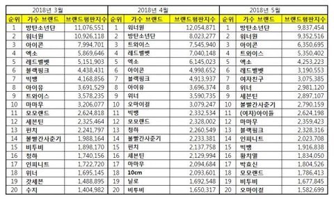 다른 아이돌들 다 왔다갔다 하는데 방탄 워너원은 딱 1,2위 지킴 왓다갓다 해봤자 서로..