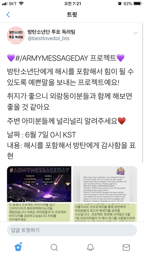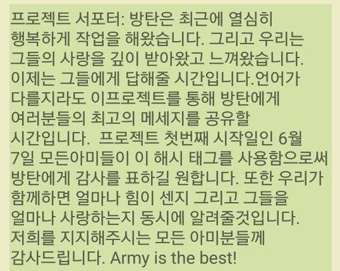 감동적이야 외랑둥이들은 좀 달라 진심으로 아끼고 표현하고 존중하는게 매번 보이니까 감사하게 된다.. 아미여서 자랑스러워 우리도 꼭 동참하자! 팬싸에서 하고싶었던 고마움을 말한다고 생각하면 될거 같아 함께하자!!