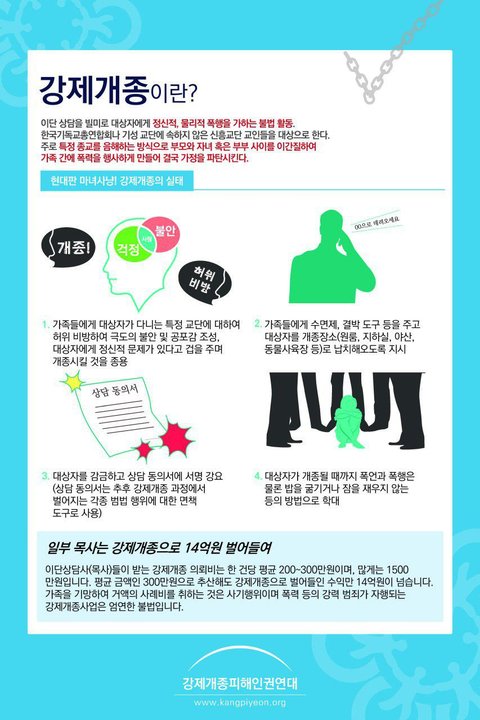 더욱이 대한민국은 헌법 제 20조 1항에 '종교의 자유'를 명시하고 있습니다.그럼에도 불구하고 다 큰 성인에게 강제로 개종을 강요하는 것은 헌법을 어기는 일이요, 명백한 인권침해에 해당됩니다!!