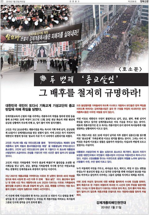 강제개종으로 사망했던 청년은 생전에 국민신문고에 강제개종금지법 제정을 간절히 호소하였지만 국가에선 아무런 조취를 하지 않았습니다.만일 이 청년의 호소를 국가에서 들어 주었다면 이러한 사망 사건은 벌어지지 않았을 것입니다!!