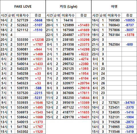 뭔 희생자? 신곡 나온 지 일주일 되면 이용자 수 쭉쭉 빠지는 거 원래 당연한 거임ㅋㅋㅋㅋ방탄도 초반에 70만 가까이 나오다가 지금까지 빠진 거고 아무리 음원 성적 좋아도 대부분 저렇게 훅훅 빠짐 ㅇㅇ그리고 24시간 이용자수랑 실시간 이용자 수가 같을 리가 없잖슴 24시간 이용자 수는 사실상 일간 차트를 결정짓는 거라고 보면 됨