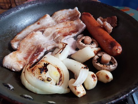 집 근처 정육점에서 삼겹살이랑 소세지, 송이버섯 사서 양파랑 같이 구워 먹었어요ㅋㅋㅋ