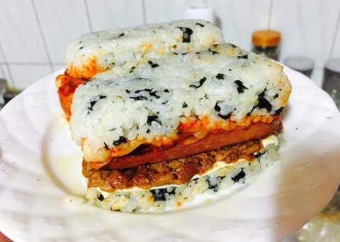 통조림 햄 통에 랩을 깔아서 김가루랑 섞은 밥을 제일 먼저 깔아주고, 집에 남아있던 제육볶음→ 스팸→ 볶음김치→마요네즈→ 다시 밥