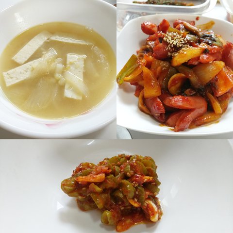 들깨가루 넣고 볶은 '무나물' 다음은 케찹 넣고 볶은 '쏘야볶음' 간장에 목욕 중인 '계란장조림' 양근당파를 넣어 말은 '계란말이' 구운 두부에 맛있는 양념을 넣어 졸인 '두부조림' 입니다
