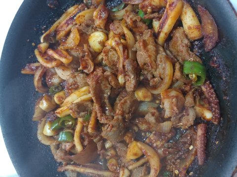 마지막으로 '오삼불고기' 입니당. 오징어가 먹고 싶어서 세일 하길래 반건조 오징어를 대량으로 구매했더니 부추전에도 넣어먹고 이렇게 삼겹살이랑 같이 볶아서 오삼불고기도 해먹었어요