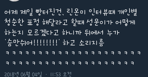 그 프듀 쇼타임 직캠엨ㅋㅋ 하성운 앞에서 안개 특수효과 터져서ㅋㅋ 팬이 빡쳐서ㅋㅋ 내가 하성운 별명이 구름이라했지 애를 구름으로 만들 랬냐고 ㅋㅋ