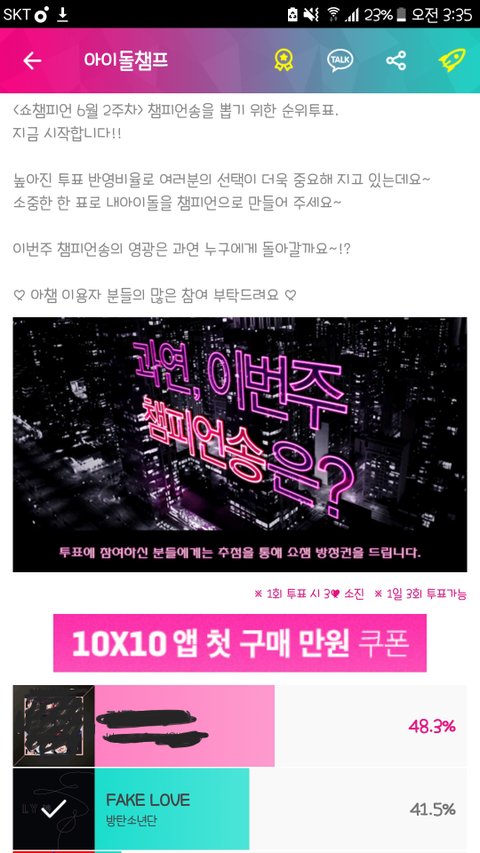 어플 다운받고 쇼챔피언 투표눌러서 방탄소년단 투표하면돼~!
