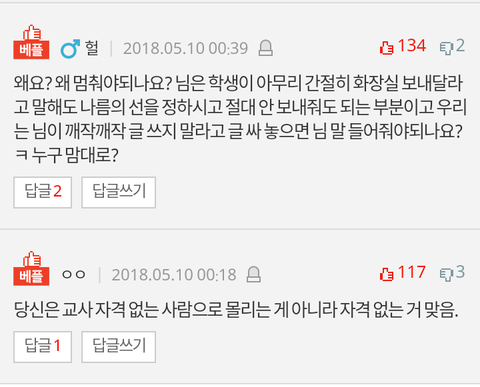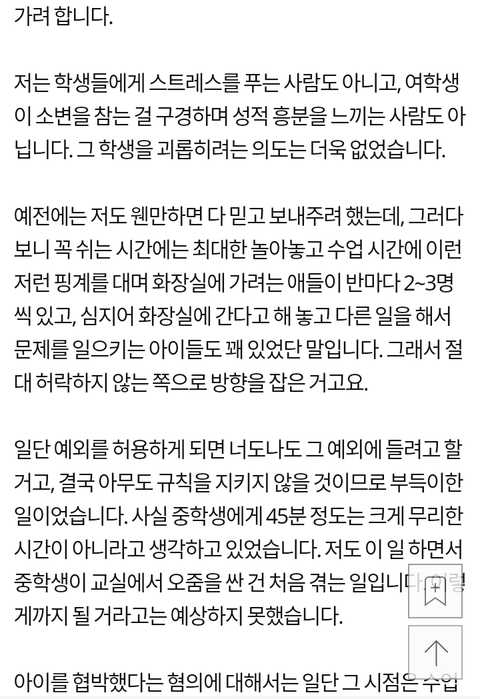 참고로 저 여학생은 전 시간부터 오줌이 마려웠지만 수업 늦게 끝나고 이동수업이라 화장실 못 갔는데 교사가 이를 듣고도 못가게 했다고 함.