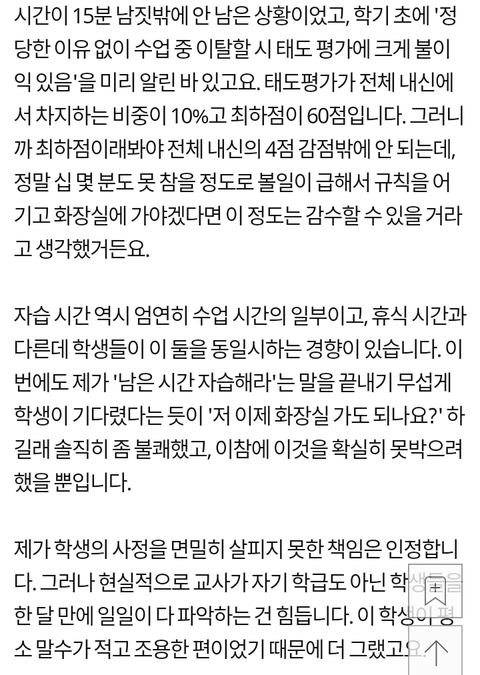 과고를 목표로 하는 학생이라 소변을 참기가 너무 힘들어도 감점하겠다는 말에 화장실을 못 갔다고.