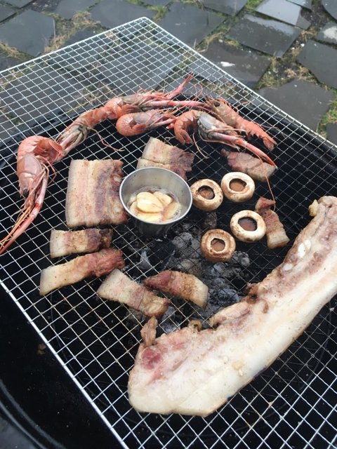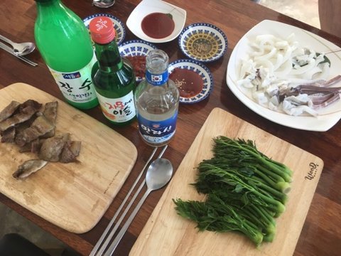 직접 잡은 무늬오징어숙회에 텃밭에서 딴 두릅 , 삼겹살에 지인들과 가볍게 술한잔