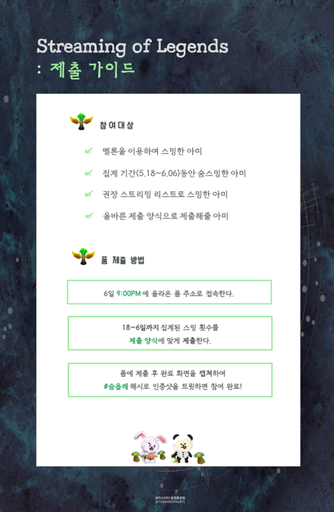 아미여러분의 많은 참여 부탁드리며 앞으로도 숨스밍 잘 부탁드립니다! 더불어 1시간 후, 10시부터 BGM릴레이총공이 시작되니 많은 관심과 적극적인 참여 부탁드립니다!