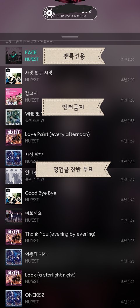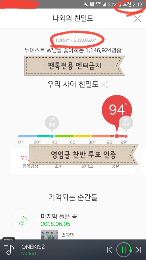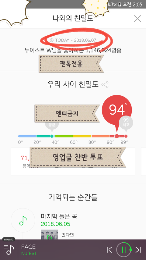 친밀도 인증에는 오늘 날짜, 음악감상 횟수 앞자리가 보여야 하며 "팬톡전용 엔터금지 영업글 찬반 투표 인증" 낙서가 포함되어야 합니다