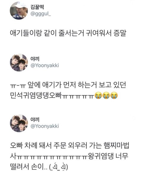 민석이 앞뒤로 다 애기들같은데 진짜 동심간직한 슈냥이 너무 귀여운거 아니냐ㅠㅠㅠㅠ